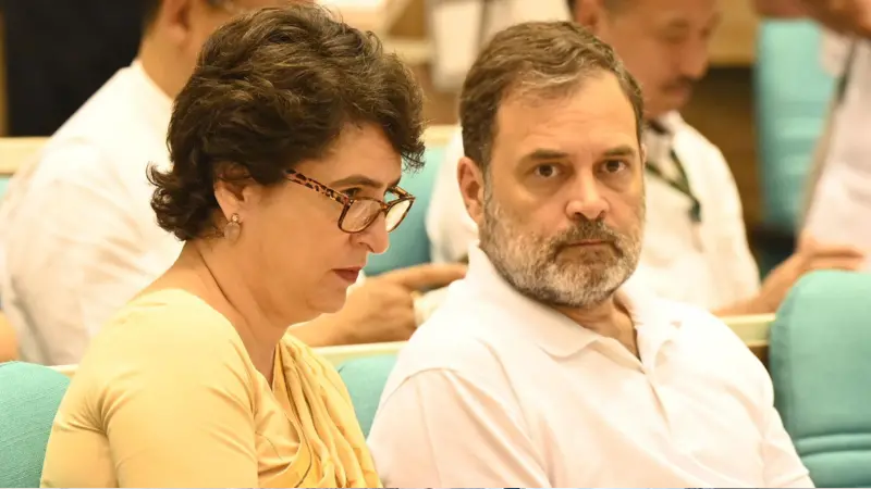 দিল্লিতে কংগ্রেস নেতা রাহুল গান্ধী ও প্রিয়াঙ্কা গান্ধী (অগাস্ট ২০২৫)