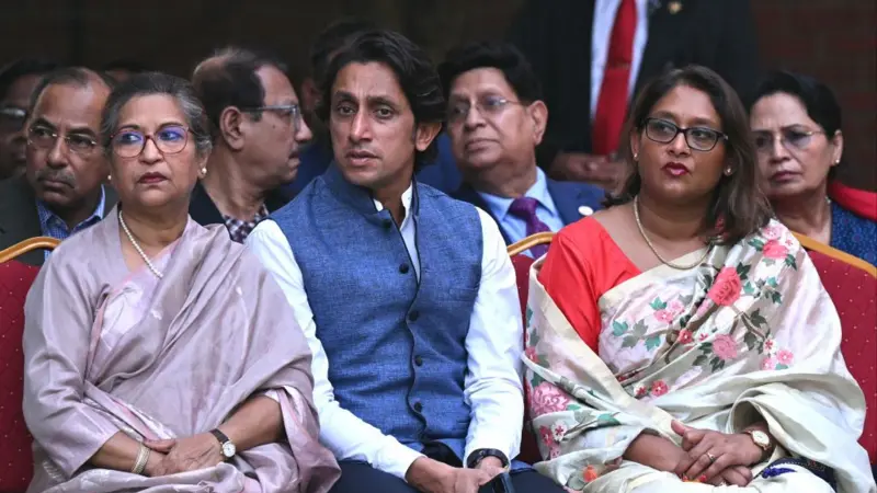 ২০২৪-এ বাংলাদেশের নির্বাচনের পর ঢাকায় এক সাংবাদিক সম্মেলনে শেখ রেহানা, তার ছেলে রেদোয়ান সিদ্দিক ও সায়মা ওয়াজেদ
